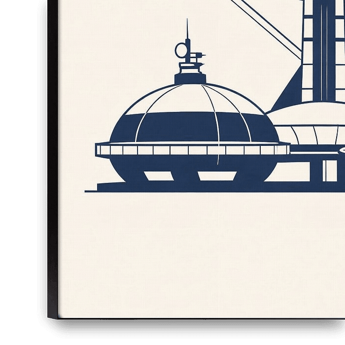 Minimalist mid-century inspired illustration of a futuristic space colony with rockets, orbiting planets, and sleek architectural towers. Rendered in clean navy lines on a soft neutral background, this retro Space Age artwork adds a modern Scandinavian touch to any interior.