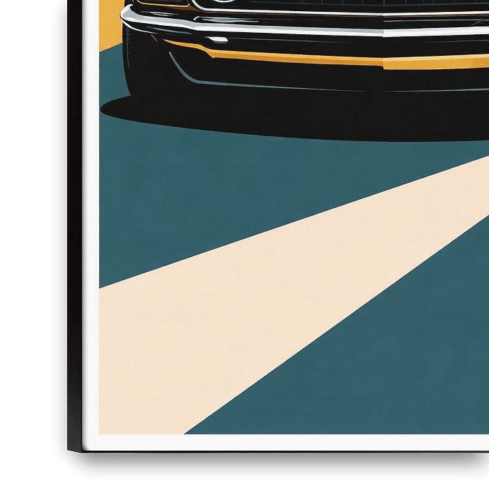 Bold front-view illustration of a retro muscle car in warm mustard tones with clean geometric shadows. This mid-century inspired automotive artwork blends vintage power with minimalist design, perfect for modern interiors, man caves, and statement wall decor.