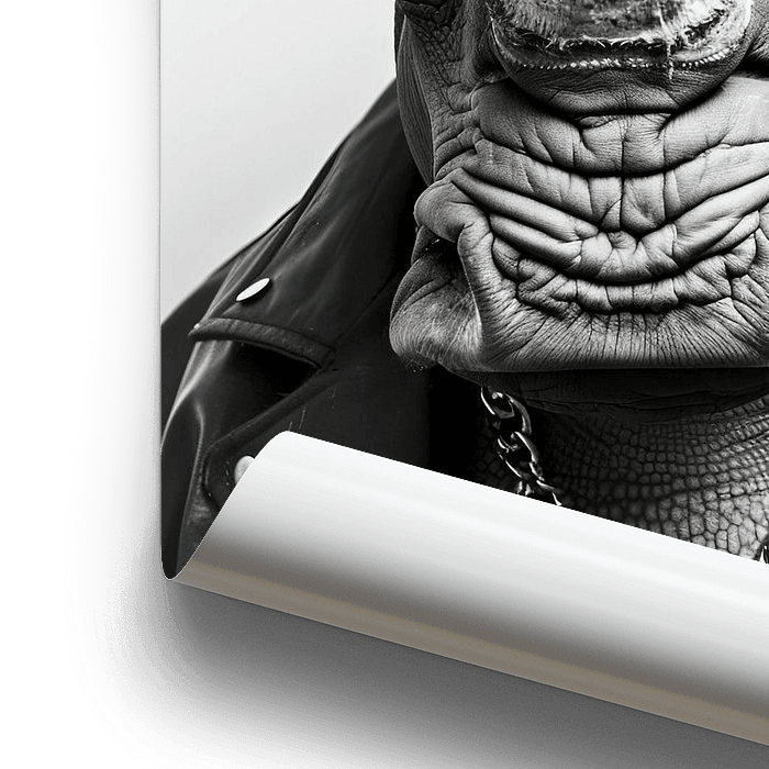 A creative portrait of a rhinoceros in fashionable clothing, such as a hat and sunglasses. Perfect style in black and white.