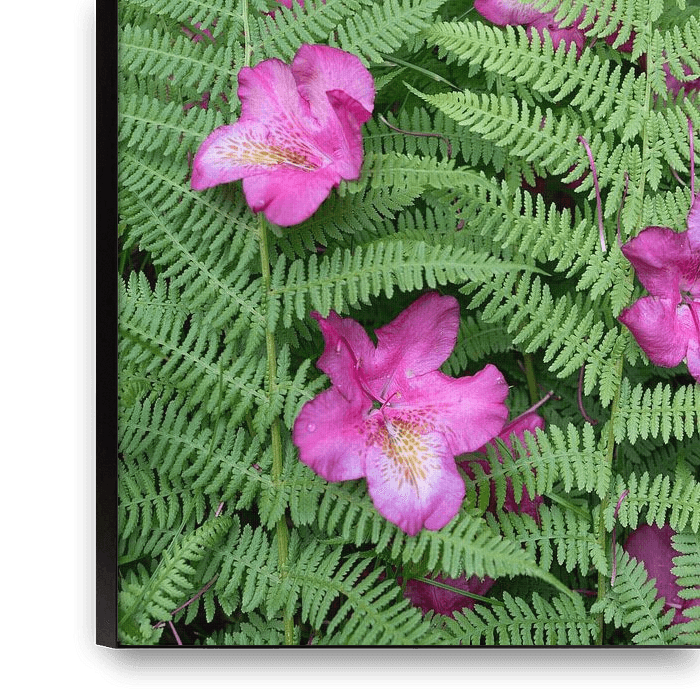 Buy this flower art Rhododendron blossoms and green fern leaves by Adriana Müller on canvas, ArtFrame, poster and wallpaper, printed on demand in high quality.