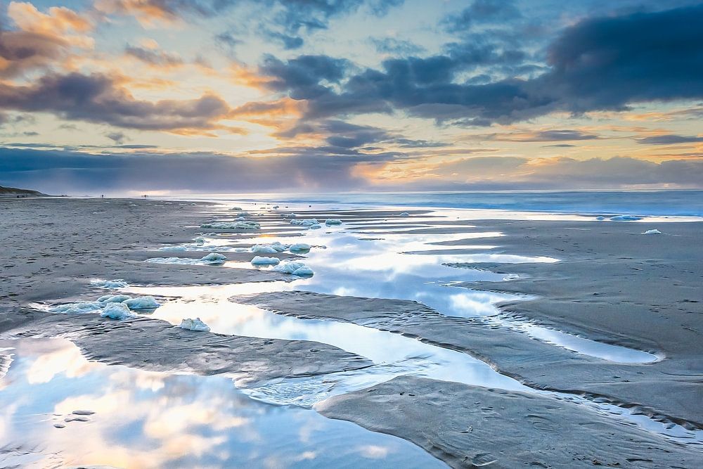 A magical moment on the North Sea beaches of the Wadden Island Texel. The dynamics of the sky and the patterns on the beach seem to come together and enhance each other in this composition. An atmospheric sunset at the Dutch coast with a wonderful depth of field.