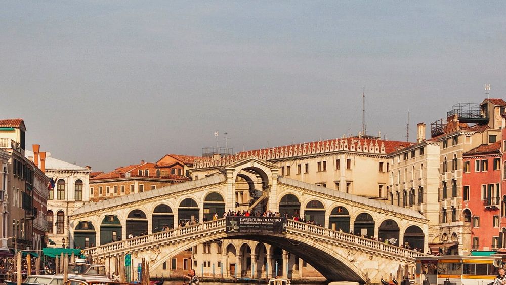 The Rialto Bridge over the Grand Canal in the Italian city of Venice in the late afternoon sun.