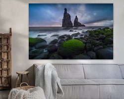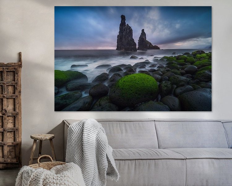 In the early morning, even before the sun shows itself, an ominous silence reigns near the rocks of Ribeira da Janela. The air is heavy and stormy, clouds sweeping fast and low over the ocean, chased by the wind. From the churning waters rise the striking rock pillars - rugged, powerful, like petrified giants that have defied the waves for centuries.