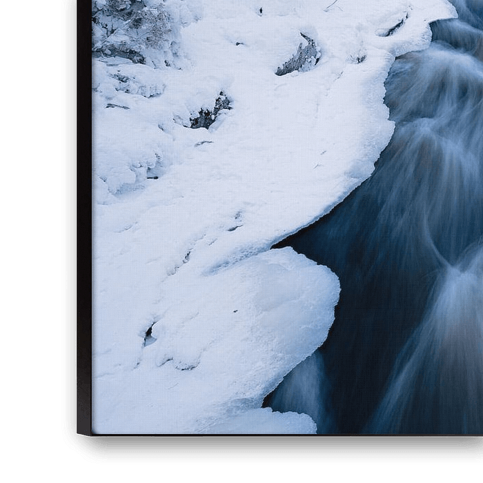 The park is known for its pristine wilderness and diverse flora and fauna. In the distance, the old Myllykoski water mill can be seen. The rest of the picture is characterized by the wild river and the winter snowy landscape.