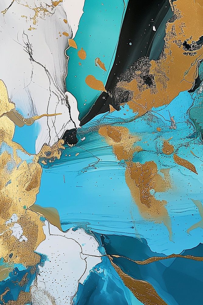 Abstract composition that attracts attention with its bold colours and elements of luxury. The prominent gold accents, combined with a palette of cool turquoise and deep blue tones, create a sense of elegance and richness. White and black sweeps provide contrast and depth, while the flowing lines and organic shapes suggest a sense of movement. This artwork can evoke associations with natural elements such as water, air and earth, as well as more human themes'such as art, luxury or exploration. The abstraction invites the viewer to make a personal interpretation, which can range from an aerial view of an exotic location to a metaphorical representation of life's paths.