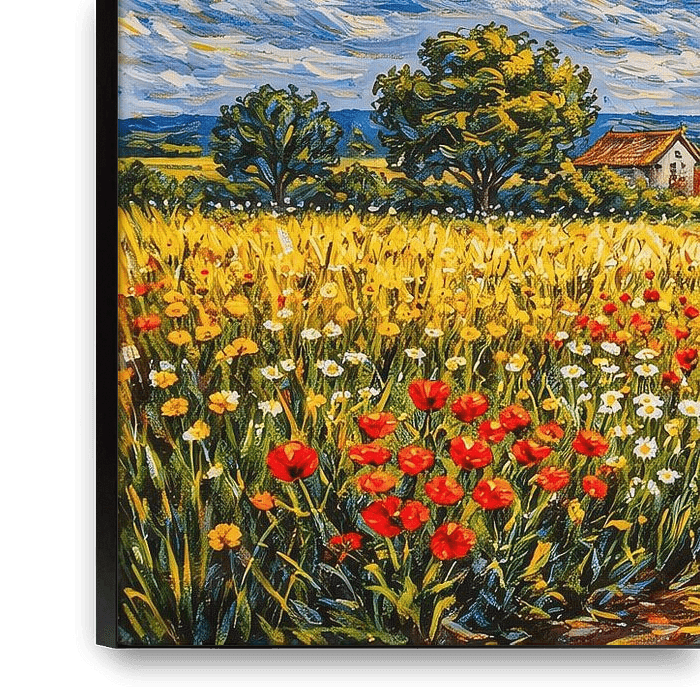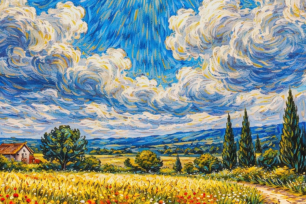 An inviting sandy path winds through a lush field full of red poppies and white daisies, creating a beautiful sense of depth in your interior. The bright sun forms the centrepiece of a swirling blue sky with expressive clouds that radiate movement and vitality. The combination of stately, dark green cypress trees and golden cornfields…