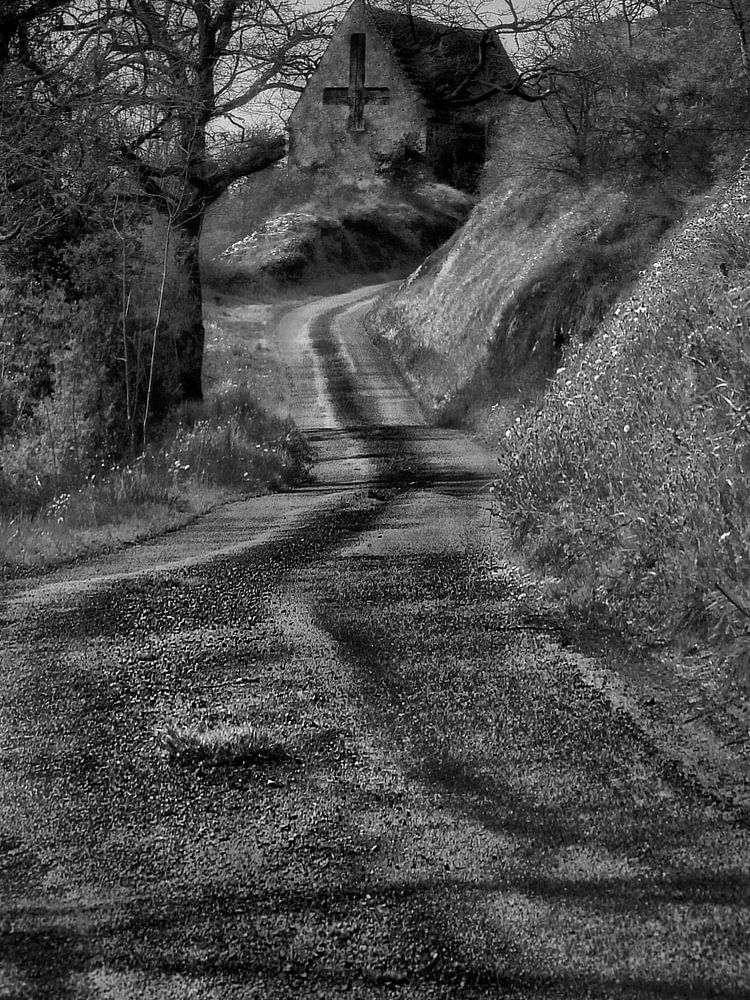 The winding road to the upper cottage intrigued me so much that I stood in the middle of the road to find the right viewpoint. The black and white editing makes it look like it was plucked straight out of a horror film.