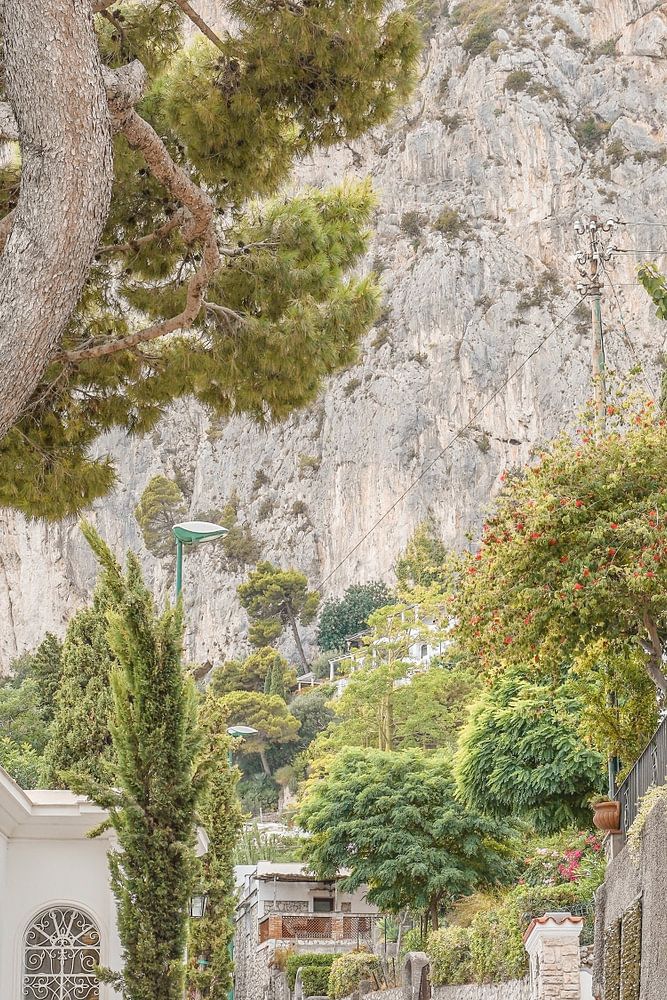 This picture shows a road surrounded by trees and plants on the island of Capri.