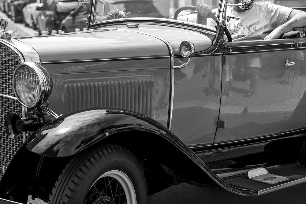 This stylish black and white image presents a beautifully restored classic roadster, presumably a Ford Model A, parked on a city street, capturing the timeless elegance of past automotive eras. The picture is taken from a slightly elevated perspective, which places the car prominently in the foreground.