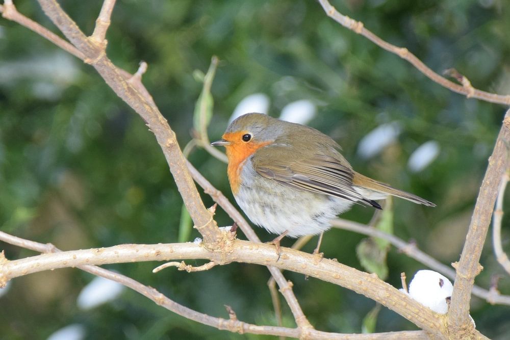 This robin was resting on a beautiful branch. The snow is still visible on the branches. The robin is kept sharp and the background blurred. This way the small, but beautiful colored bird stands out well.
