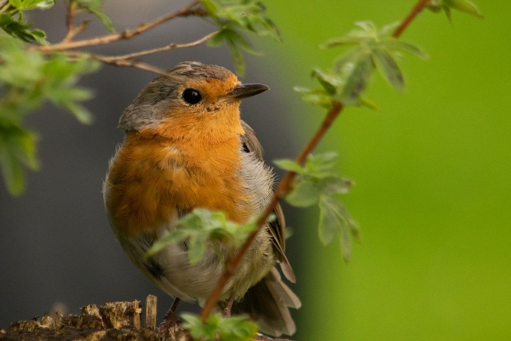 A robin sitting on a fence behind a hedge, curiously looking out into the world.