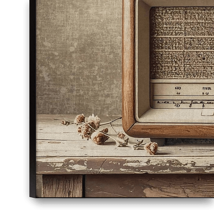 An old-fashioned sense of cosiness. An image from days gone by. This robin sits jauntily on an old-fashioned tube radio. Behind the radio is a vase with beautiful flowers. This bouquet has white yellow and pink colours. The artwork has a lot of texture and exudes peace and warmth.