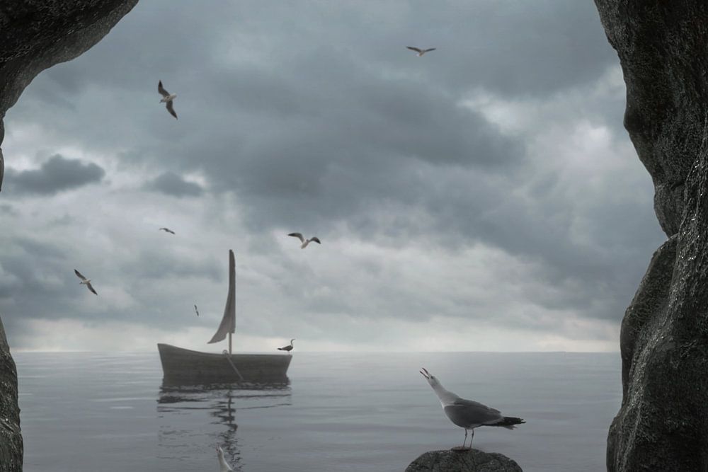 Rock cave with view of the sea with seagulls flying around and abandoned boat by Besa Art