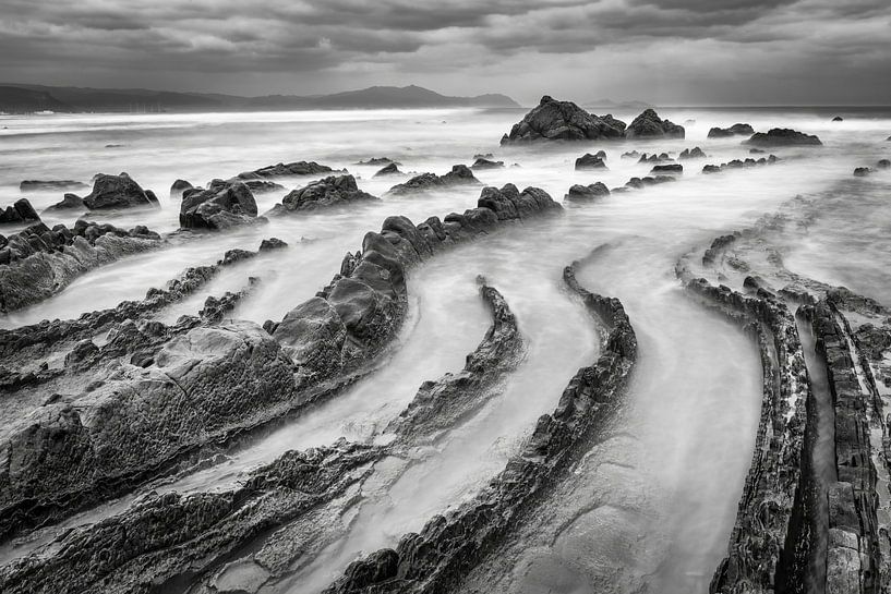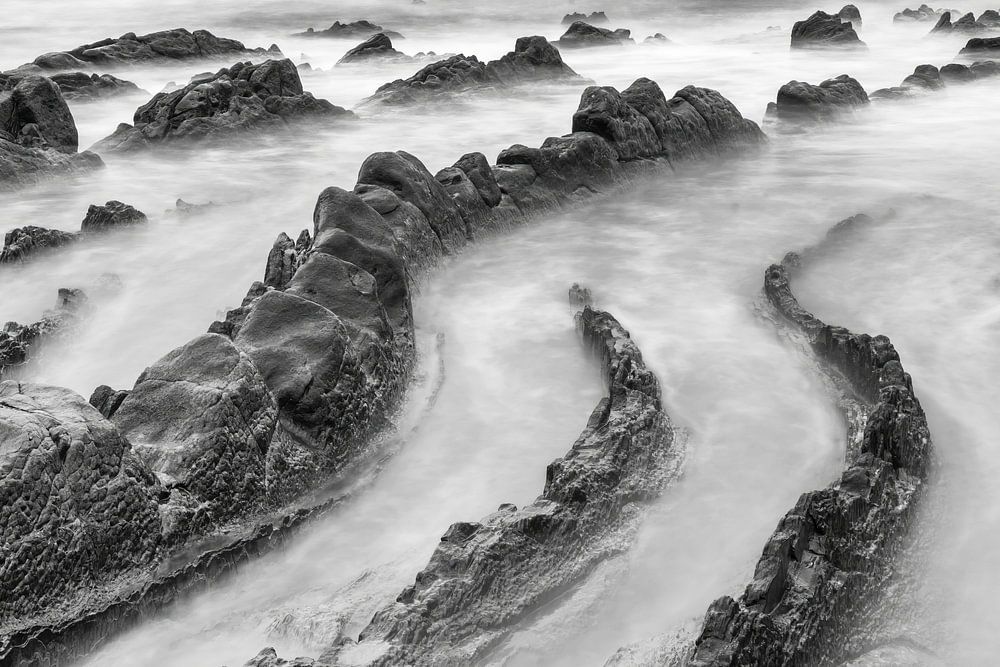 Rocky coast along the Spanish province of Biscay in the north of Spain. The photo is in black and white and shows jagged rock patterns and lines in the foaming waters of the sea.