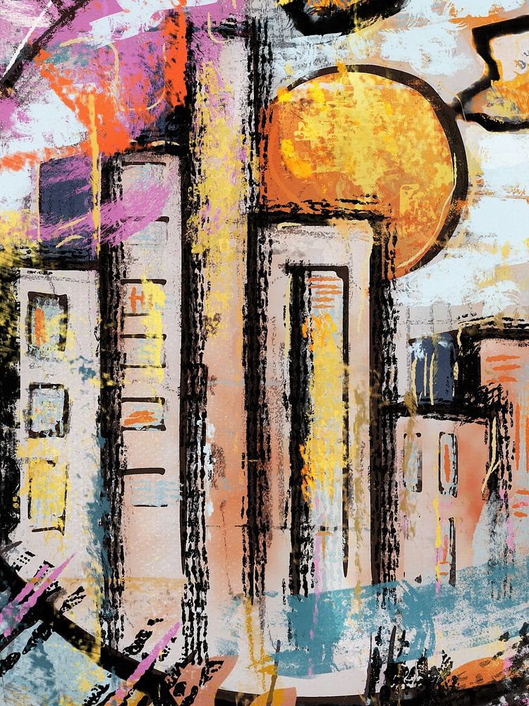 An abstract rendering of a roller coaster with a city in the background. Colourful semi-abstract artwork in orange grey pink and lilac colours.