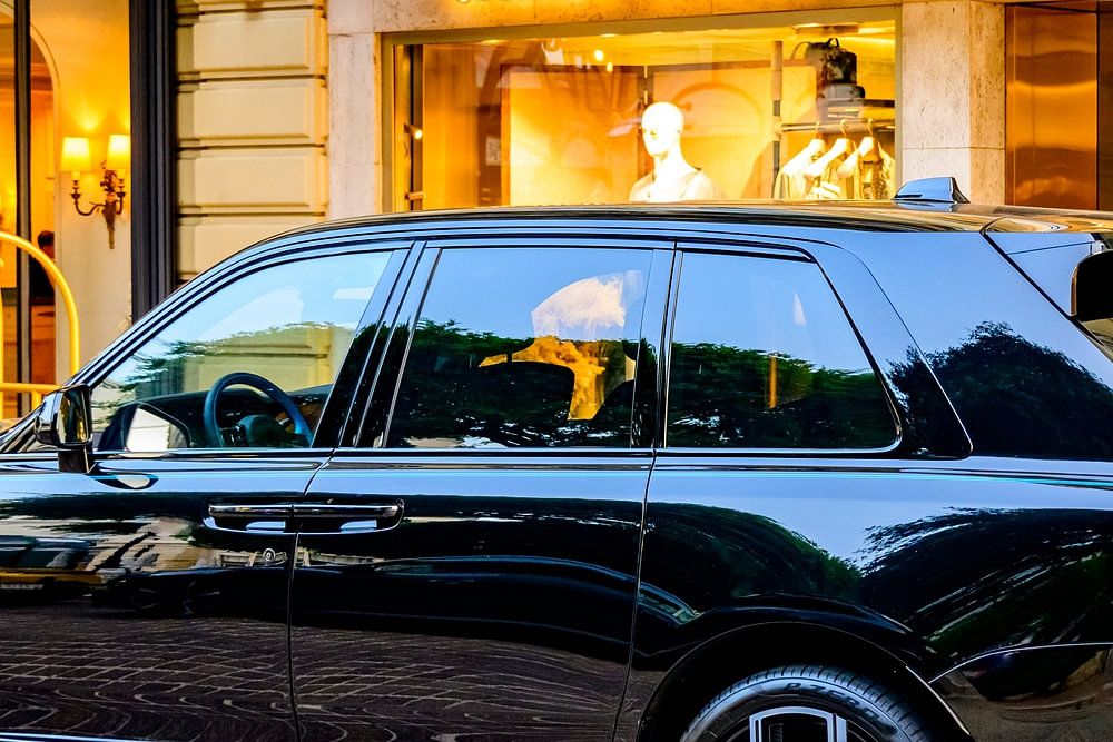 Rolls Royce Cullinan luxury SUV parked on the street in front of the Giorgio Armani store in Monte Carlo, Monaco along the Côte d'Azur.