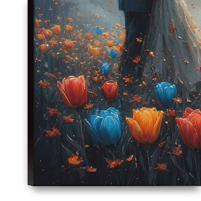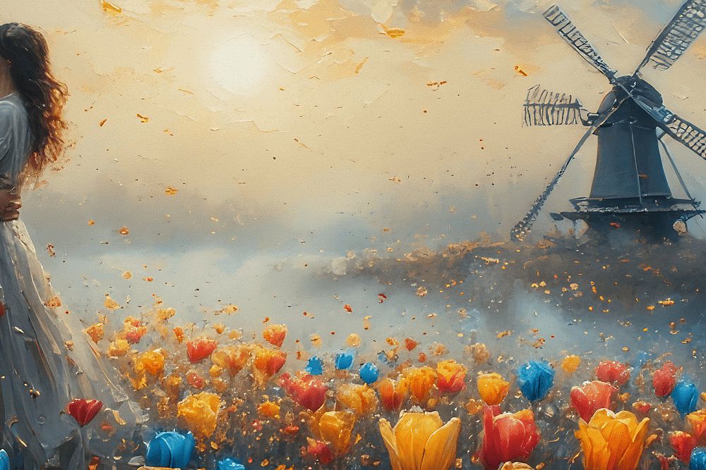 A breathtaking cinematic impressionist painting of a romantic couple standing in a vibrant tulip field at sunset. Warm golden light illuminates colorful red, yellow, and blue tulips while a classic windmill fades softly into the misty background. Autumn leaves float gently through the air, adding motion and emotion to the dreamy…