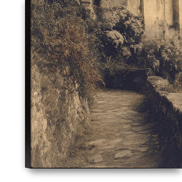 An abandoned castle balances on the edge of a steep cliff, half hidden among dense greenery and overlooking a mist-filled valley. The narrow windows, old tiled roof and winding path leading to it give the impression of an abandoned watchtower that once guarded a passageway. In the distance, mountains dissolve into soft mist, giving the…