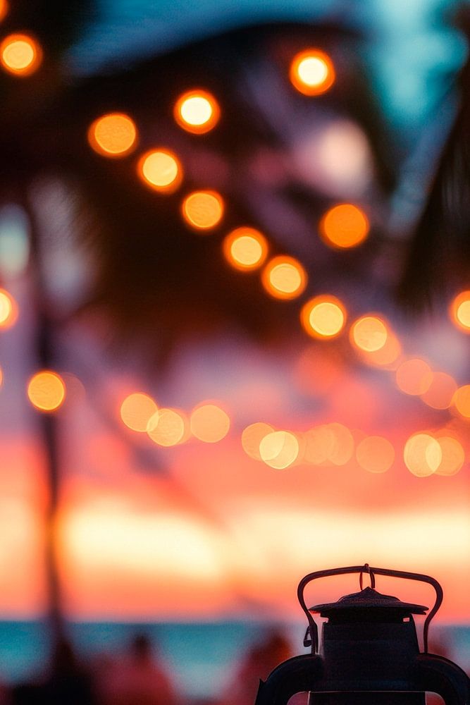 A warm glow envelops the scene, while the nostalgic lantern in the foreground glows softly. Behind the soft light, a play of colours unfolds from warm sunset tones and festive lights, framed by majestic palm trees. This wonderful picture brings a relaxed holiday atmosphere into the living room and invites you to dream.