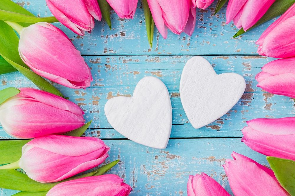 Romantic valentine or wedding card with two heart shapes and pink flowers