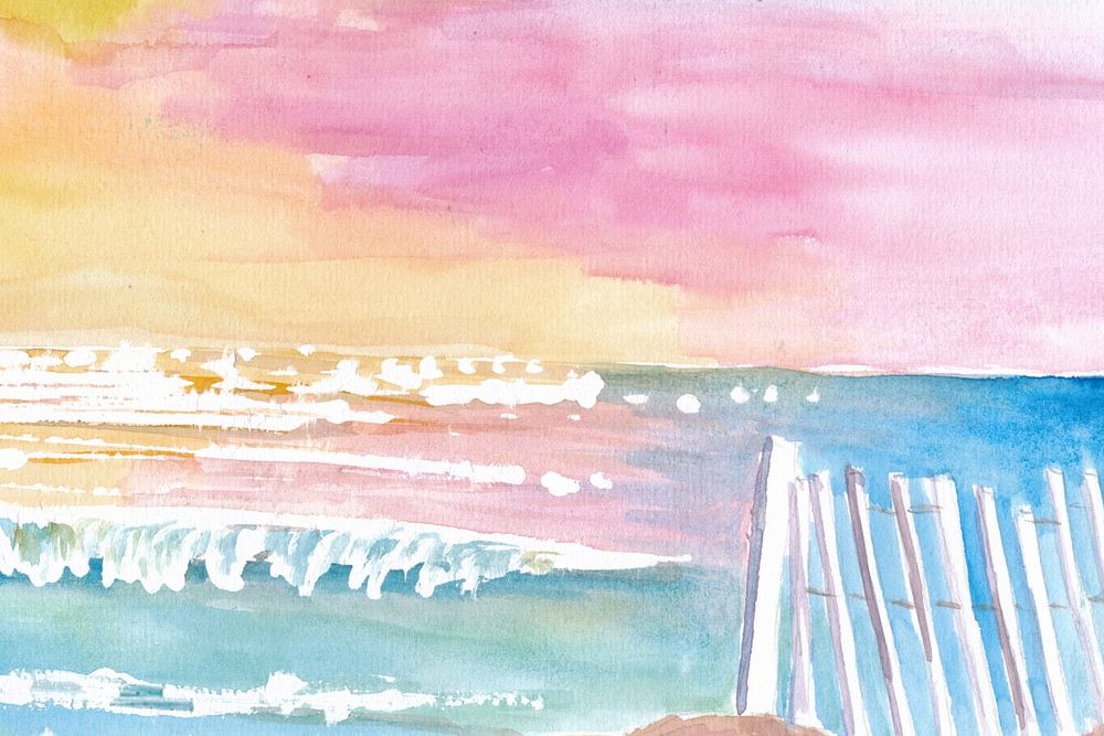 About "Romantic white picket fence on beach with waves and sunset"