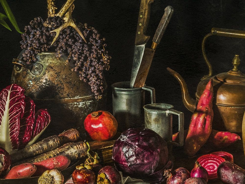 A still life in the style of the Old Masters with red and pink vegetables, fruit and Tulips, complemented by French bric-a-brac. Radicchio, purple carrots, sweet potato, pomegranate, turnips, onions, potatoes, garlic, dried dates, red cabbage. On an old oak grain box against a dark background.