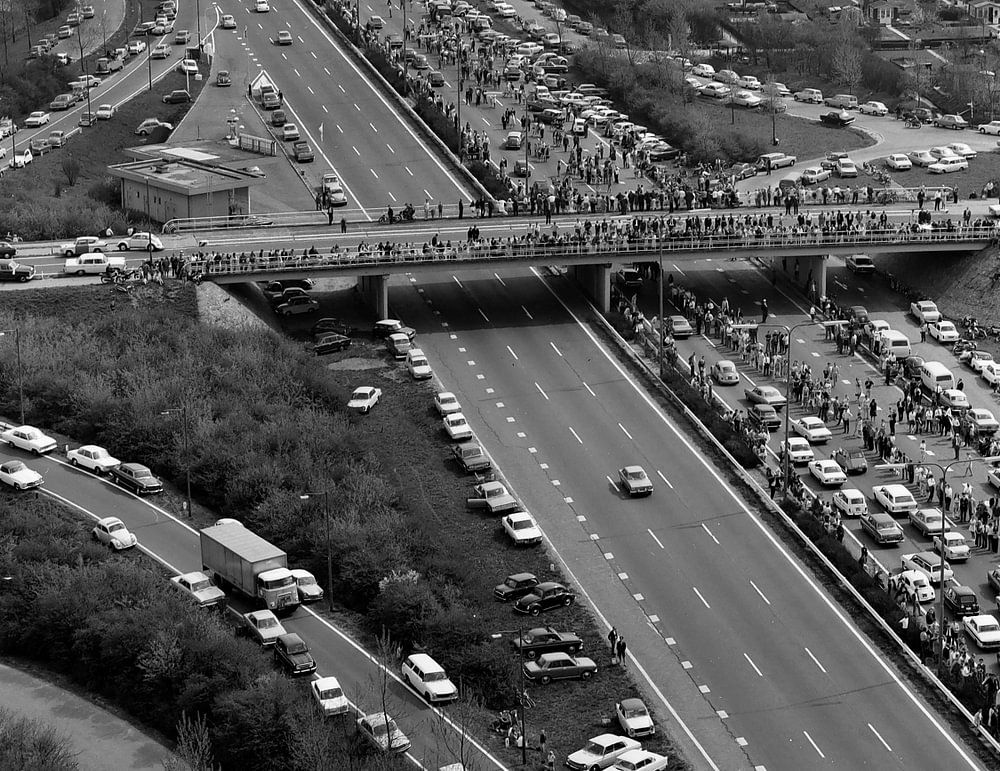 Rotterdam airport Zestienhoven - Feijenoord return after the game against Celtic in Milan on 7 May 1970 - Traffic jam on the motorway - Aerial photo - Europacup 1