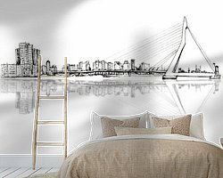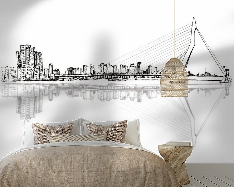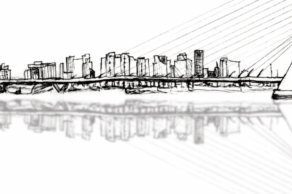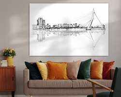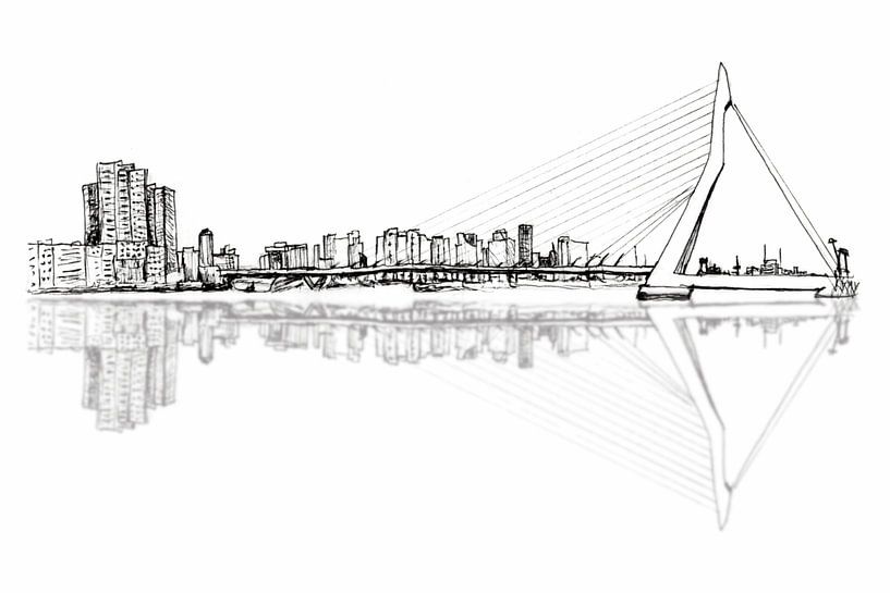 The beautiful skyline of Rotterdam with the Erasmus Bridge. Drawn in urban sketch style classic black and white grey drawing art. Indispensable on the wall of every Rotterdammer and lover of this great city!