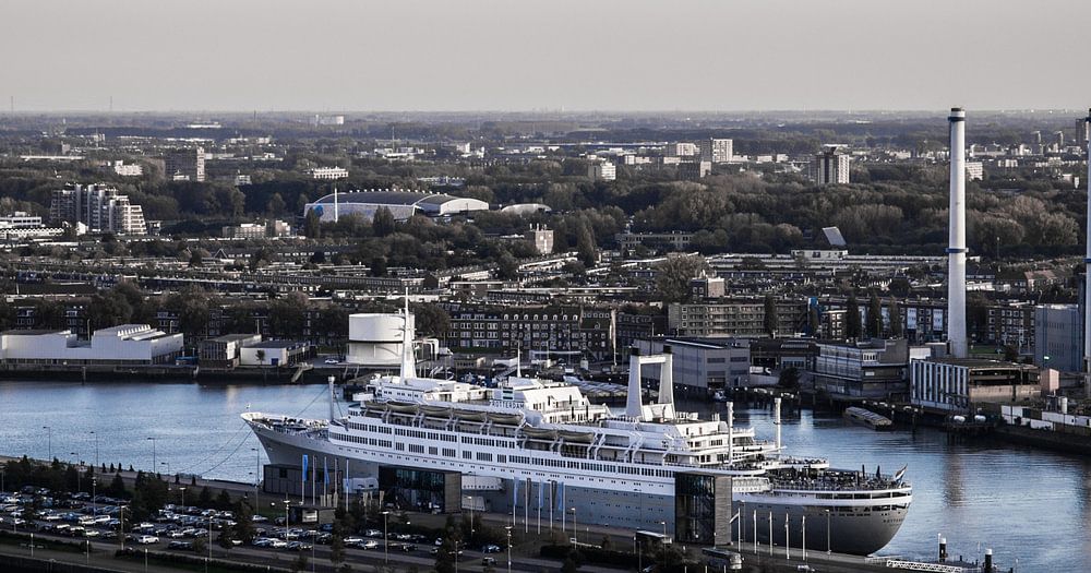 Rotterdam Skyline, met op de voorgrond de "SS Rotterdam" en daarachter zie je ook nog Ahoy.
