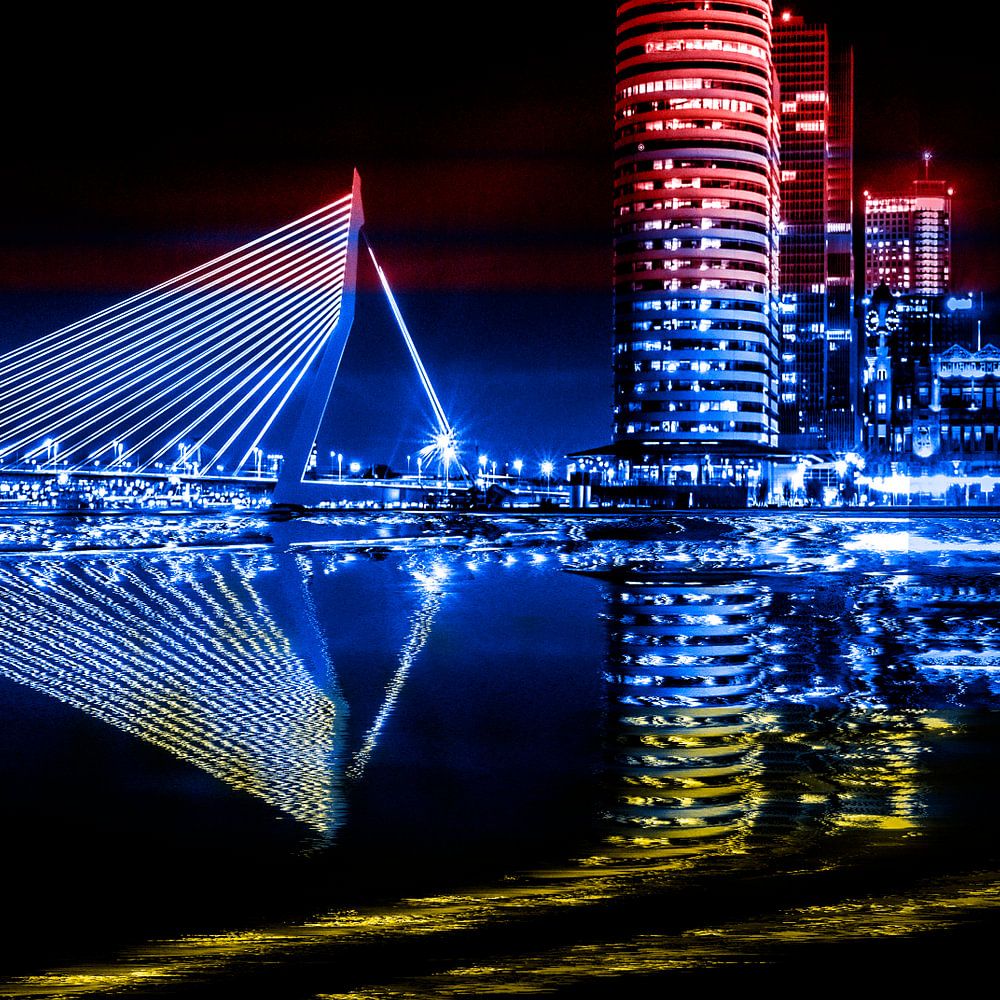 Rotterdam at night with the Erasmus Bridge, Kop van Zuid and Boompjes in the background. An artistic impression , where the Nieuwe Maas river winds through the beating heart of Rotterdam.