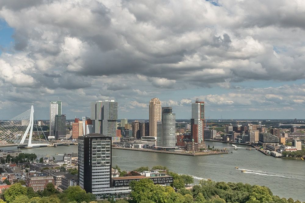 You can see the Skyline of Rotterdam photographed from the Euromast here. The Nieuwe Maas with The Park as a green buffer between the Euromast and the Erasmus Bridge in the distance. On the far left of the picture is the tallest building in the Netherlands 'De Zalmhaven' with a height of 215 metres.