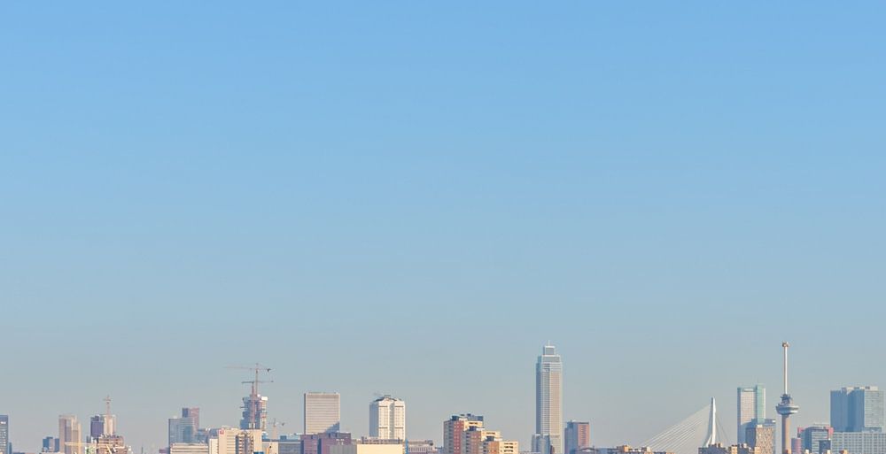 The skyline of Rotterdam as seen from the water. I took this picture during a cruise through the port of Rotterdam. The famous buildings (Euromast, Erasmus bridge the new Zalmhaventoren) of the city you see under a clear blue sky therefore in a different way.
