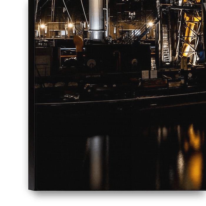 Night photograph of the sand dredger in the harbour with the coloured flats in the background and the illuminated Erasmus Bridge in the distance.