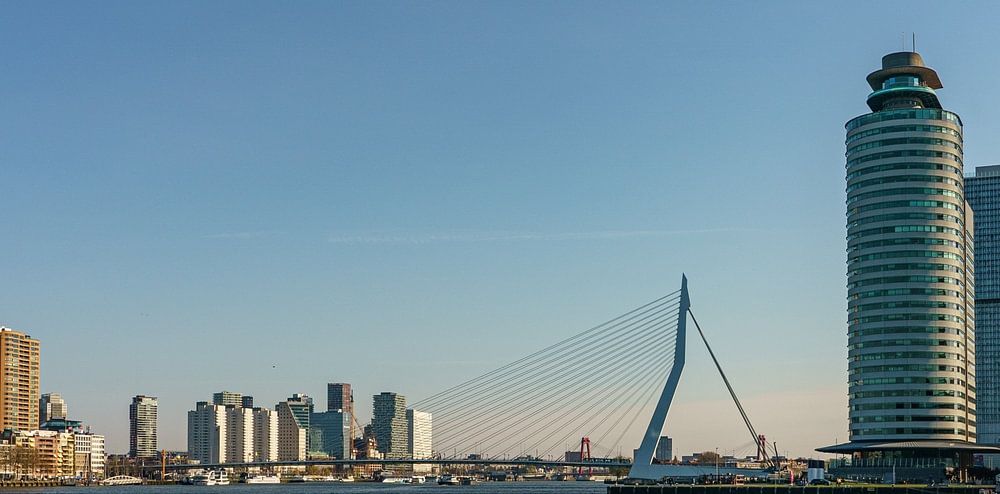 Skyline of Rotterdam. The photo includes the Kop van Zuid, Erasmus Bridge and Rotterdam's tallest building, the Zalmhaven Tower. This photo was taken on 15 April 2023 along the Nieuwe Maas near Katendrecht.