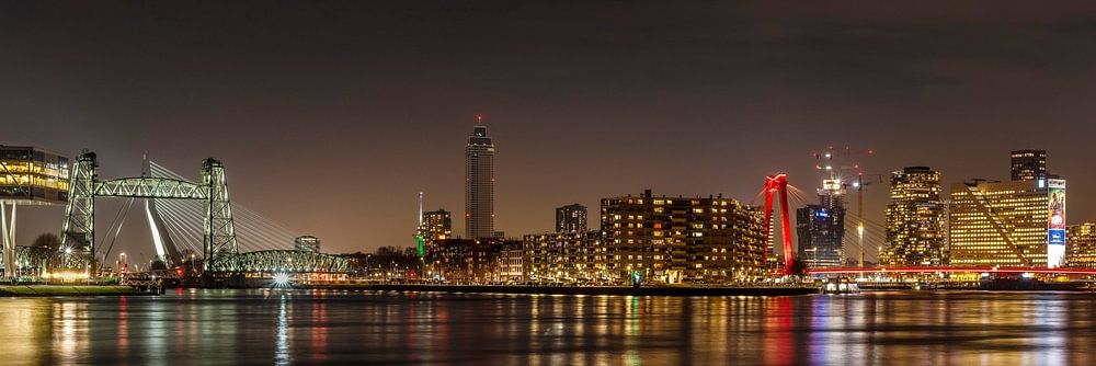 Panorama of Rotterdam, including the Erasmus bridge, Willemsbrug, the Hef, Euromast and the Unilever building.
