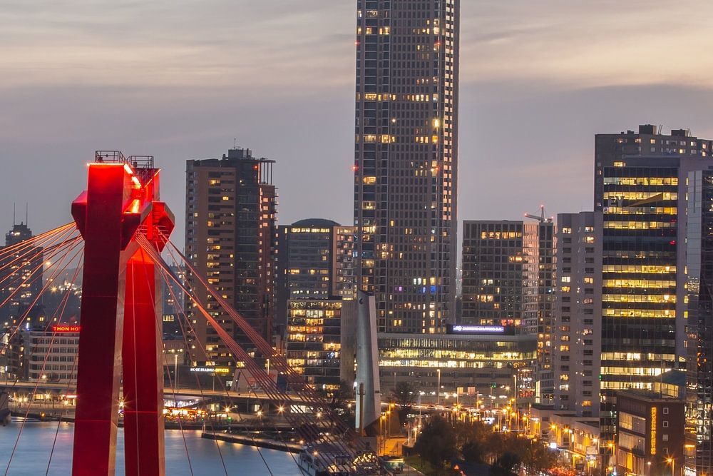 Rotterdam during sunset. Always a magical moment when all the lights go on. This photo was taken with a slower shutter speed, turning the busy traffic into beautiful streaks of light.