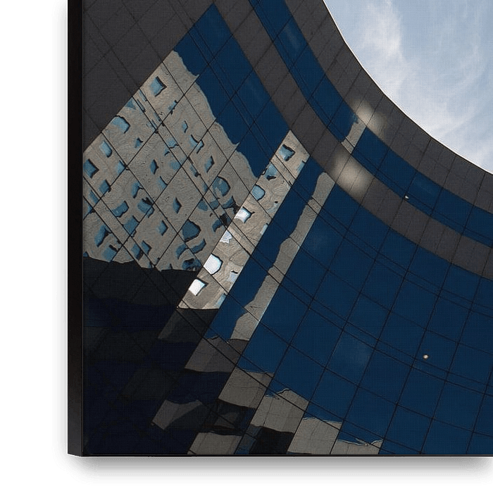 Modern office building in Paris' La Defense district reflecting other buildings and the blue sky.