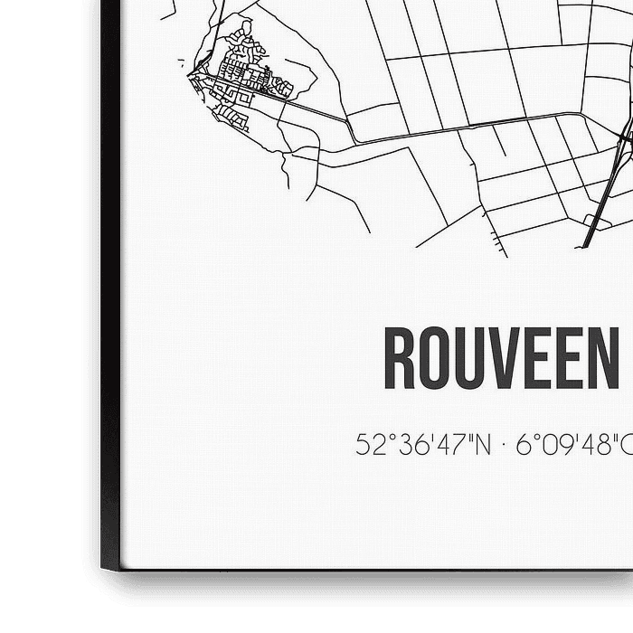 Black and white map, street map or street plan of Rouveen. Rouveen is located in the municipality of Staphorst, province of Overijssel. The city map includes all public roads in Rouveen. Furthermore, the map is provided with the coordinates of the center of Rouveen.