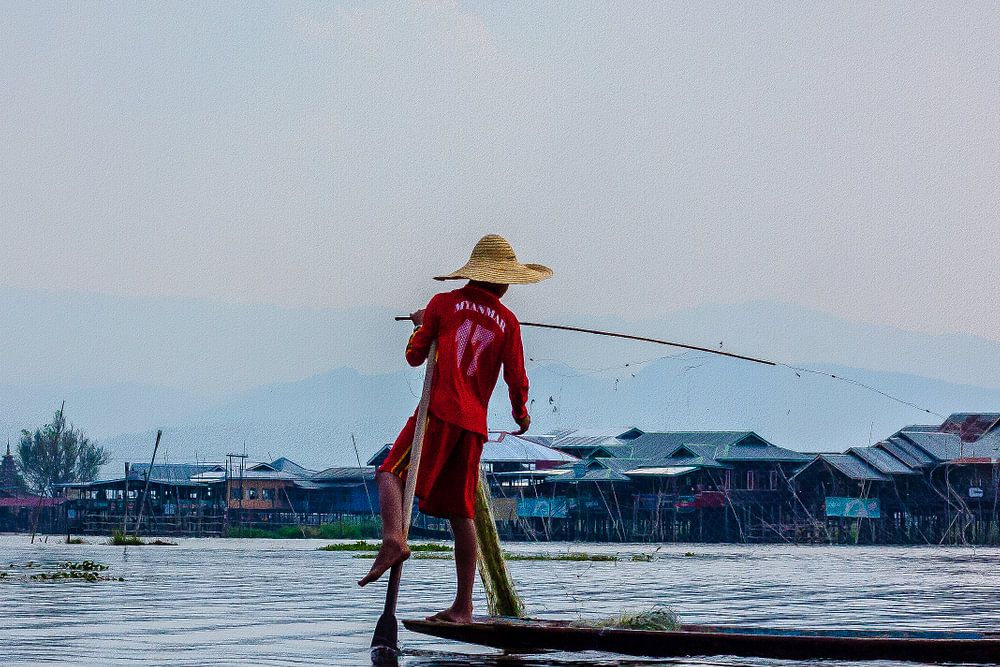 Fisherman in Myanmar (Inle Lake) where one traditionally rows with one leg.