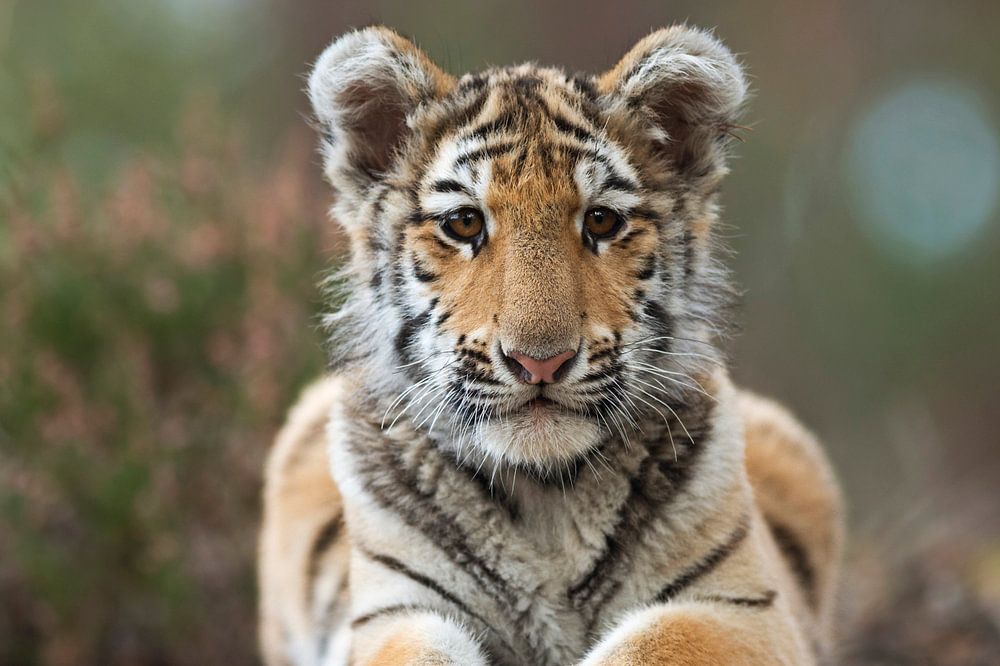 Royal Bengal Tiger ( Panthera tigris ), young cute animal, resting on the ground of a forest, frontal view, showing its huge paws.