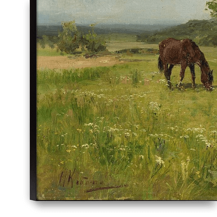 In his “Rural Landscape” the artist effectively conveys the unhurried nature and steady rhythm of rural life. It is a traditional countryside scene: a horse grazes as hens wander by in the foreground, drawing the viewer into the space of the image. To the side, a log house and a hay barn with folded bales underneath reflect the hard labor of the peasants. Fir trees rise above the buildings and slender birches grow nearby. The roads scatter to different directions, one of them leads the spectator down the hill and further to distant horizons.