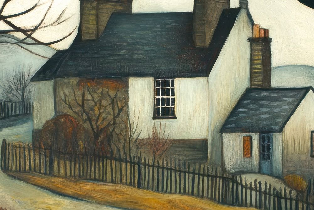 A country house with several chimneys is surrounded by bare trees and a winding path leads to it. The landscape is characterised by rolling hills in the background and a fence surrounding the property.
