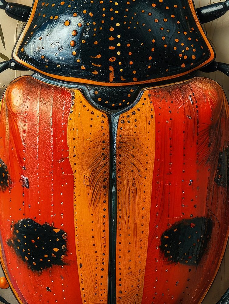 The beetle is rendered with great attention to detail, with the vibrant orange and black patterns on the shield contrasting beautifully with the soft blue and weathered background. The insect figure, blown up to an almost mythical size, is surrounded by flowers and plants painted in a similar style, evoking the feeling of an idealised nature.