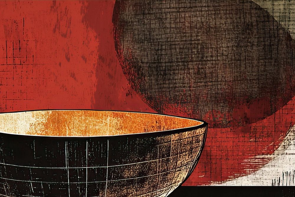 Rustic Silence | Rustic Bowl - This abstract painting shows a prominent image of a large, deep bowl with black line drawings on a background with rustic textures in red and beige, with a large, blurred circle in the background providing a serene contrast.