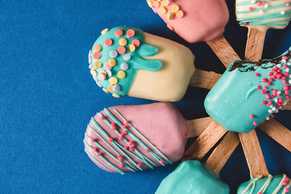 Various cake pops in the shape of ice lollies, colored ice lollies, colored, sweet, sugar, ice cream, delicious, enjoy, tasty, colorful, blue background, chocolate ice cream, colored, many colors, children's cake, children's party, party, cake, ice lollies, icing, brightly colored