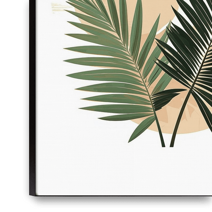 An enchanting painting that embraces the warmth of nature in a beautiful sage-green boho style. Abstract images of palm leaves unfold on a canvas of soothing greenery, dancing in harmony with the subtle breeze of imagination.