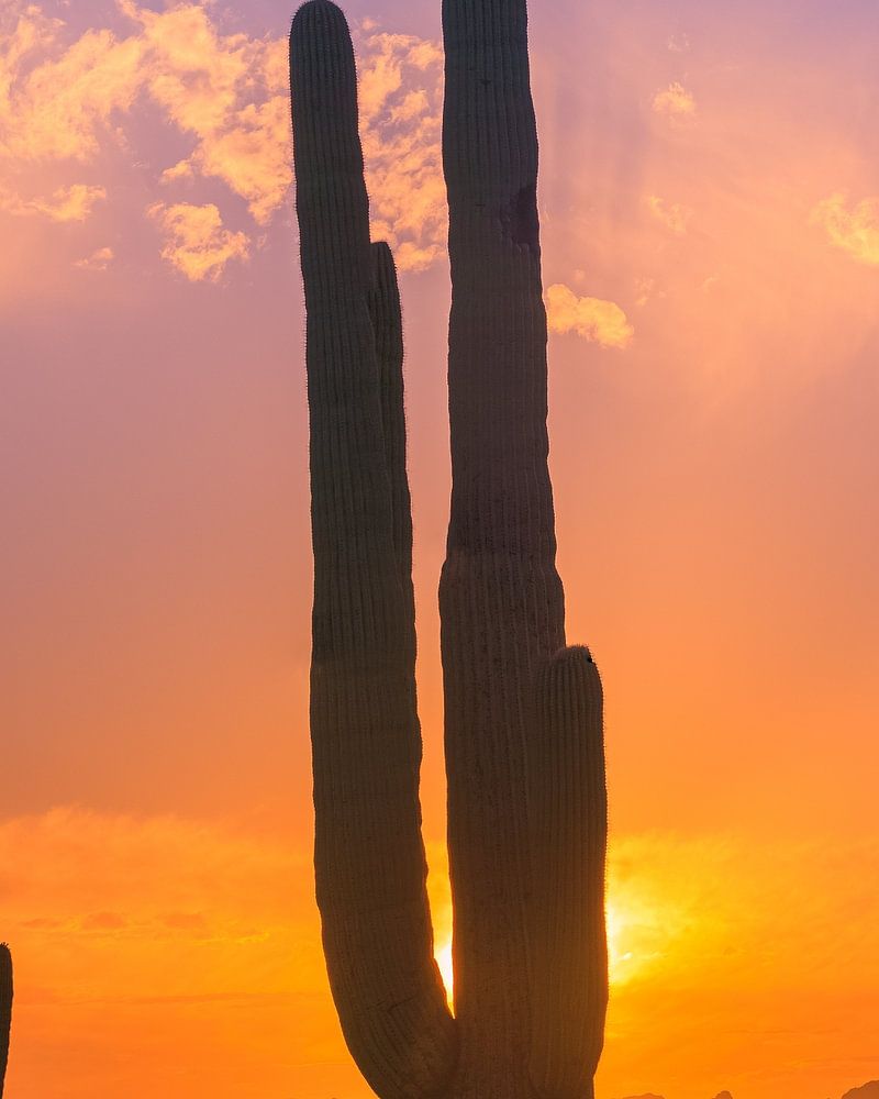 A large Saguaro cactus during sunset at Lost Dutchman State Park, a 320-acre state park near the Superstition Mountains in southern Arizona, United States.