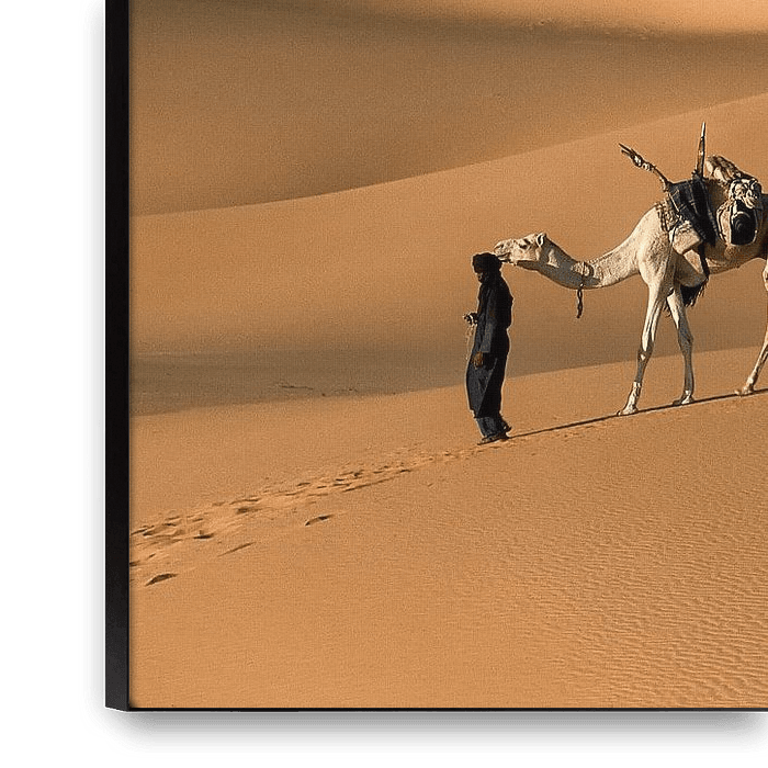 Buy this landscape artwork Sahara desert. Camel drivers and camel caravan by Frans Lemmens on canvas, ArtFrame, poster and wallpaper, printed on demand in high quality.