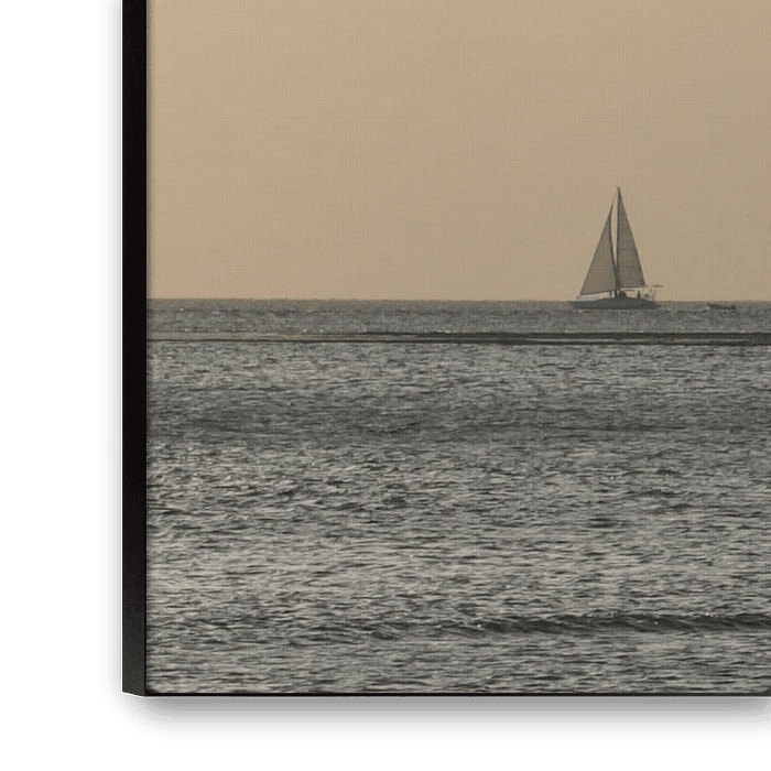 Captured on the peaceful shores of Gili Gede, Indonesia, this minimalist seascape shows a lone sailboat drifting across calm waters at dusk. The soft, warm sky and the simple yet beautiful sailboat. A soothing piece that brings space and calmness into any room.