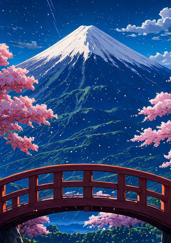 Experience the harmony of tradition and nature with Moonlit Red Bridge and Mount Fuji. This captivating artwork depicts a scarlet Japanese bridge arching gracefully over calm waters, its reflection glowing under the soft light of the full moon. Framed by vibrant cherry blossoms and lantern-lit paths, the scene leads the eye to Mount Fuji, standing tall against a starry sky. Falling sakura petals drift across the landscape, symbolizing peace, beauty, and impermanence. Perfect for lovers of Japanese culture, serene landscapes, and timeless nightscapes.